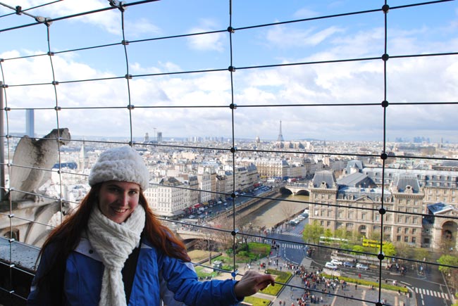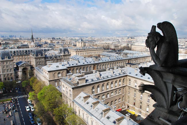 Мы думали что нам повезло и нас миновала участь стоять несколько часов в очереди в этот день… Но оказалось что вход на верхние башни собора находится отдельно с улицы. Пришлось стоять 2 часа в очереди под дождем – зато было не обидно терять время, все равно ничего другого в такую погоду делать не хотелось. С 35-метровых башен действительно открывались симпатичные виды. И хотя это не первый готический собор увиденный сверху – похожий есть например в Оксфорде – но горгульи и химеры Нотр дама были просто неотразимы. Одни из них не скрывая скуки, подперев подбородок лапой, наблюдали за мирской жизнью протекающей внизу. Другие грызли такую же каменную, как и они сами, пищу – кто виноград, а кто и что посерьёзнее. По легенде горгулья – это драконовидная змея, обитавшая во Франции, в реке Сене.