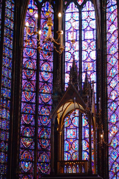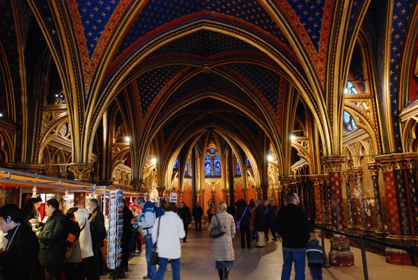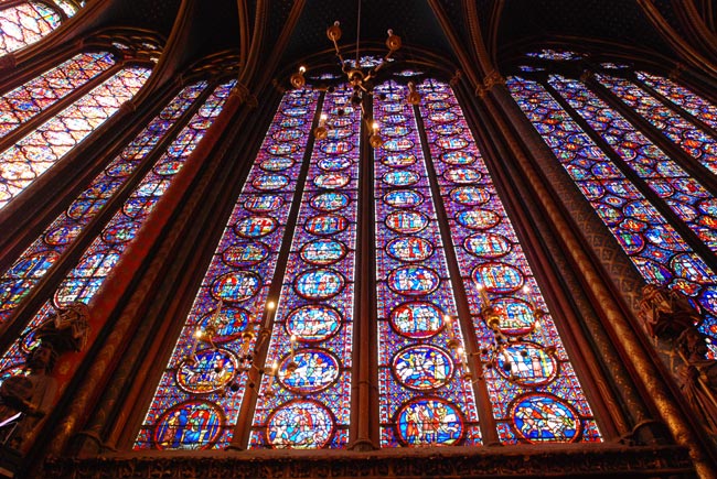 Привычная очередь, и мы внутри церкви с удивительными витражами Сент-Шапель. Часовная состоит из двух уровней – нижнего, который предназначался для простых смертных, и верхний, для королевской семьи. Верхний уровень это что-то волшебное – с двух сторон находятся 15-метровые цветные витражи, изображающие более тысячи сцен из Ветхого Завета.