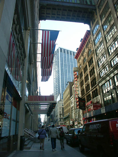 Начали прогулку c улицы Бродвей и шли по ней вниз по Манхэттену, до Гудзонского залива. Собственно Бродвей ничем не выделялся из параллельных улиц, идущих в том же направлении, кроме своего названия разумеется :). Но мы решили что будет приятнее вспоминать что мы гуляли по Бродвею, чем по какой-нибудь безымянной 17-й street :). Город ОЧЕНЬ грязный и многолюдный. Мусор здесь вывозят экзотическим способом – вечером сваливают мешки с мусором прямо на тротуары. Можете представить, как выглядит тротуар рядом, например, с каким-нибудь Макдональдсом… брррр… Огромное количество черных уличных торговцев, почему-то продающих в основном женские сумки :). По пути зашли в Chinatown, по размерам он побольше Вашингтонского, но какой шумный и грязный… И нет там таких красивых арок в китайском стиле, как в Вашингтоне. Может конечно они и есть, но нам не хватило терпения исследовать его весь. Потом по пути зашли на Бруклинский мост (это я всех затащила туда 🙂 ), вид оттуда очень красивый – внизу залив, небоскребы Манхэттена, на другом берегу собственно Бруклин, русский район (туда мы съездили чуть попозже). Сам мост красивый, подвесной, чем-то похож на Сан-Францизский, ну естественно только в уменьшенном варианте :).