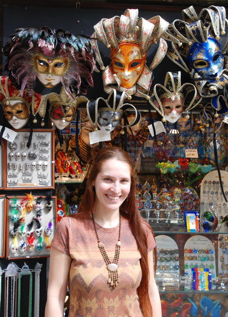 Вторыми на помощь туристам в расставании с деньгами приходят, конечно же, магазины и сувенирные лавки, продающие в основном карнавальные маски и изделия из стекла. Действительно, стекла очень много и изготавливают его на соседнем острове Мурано, который исторически славился своими стекольщиками. Мы только сейчас вспомнили словосочетание “венецианское стекло”, при котором непременно в памяти всплывает нудный монотонный голос какого-нибудь экскурсовода “эта ваза из венецианского стекла, привезенная специально для Генриха такого-то…”. Ведь действительно, стекло из Венеции всегда высоко ценилось. В одной лавке турист-китаец мне заговорщицки улыбнулся, я сначала не поняла почему, но проследив его взгляд, поняла, что мы с ним собратья по марке фотоаппарата. Кэноновцы, никоновцы… вот так и зарождается религиозная нетерпимость :).