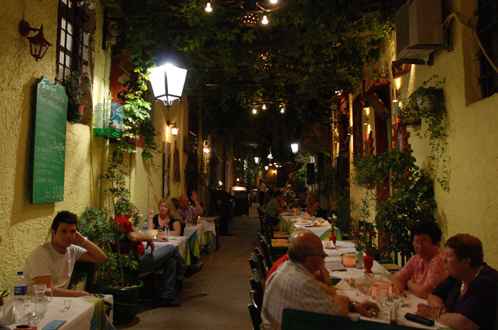 Еда в Греции вкусная, вот только если бы отобрать у греков уксус и лимон, ей бы вообще цены не было :). Часто мы не могли есть блюда именно из-за этого настойчивого кислого привкуса. Хотя, надо признать, для местного климата он вероятно уместен. В Лондоне, например, я почти не употребляю греческий салат с его кислым сыром фета, как-то не идёт, а в Греции это был почти непременный атрибут каждого нашего обеда. Правда, греческий греческий салат немного отличается от лондонского греческого: в Греции в него не добавляют листья салата, как в Лондоне, а сыр фета не нарезают вовсе, вместо этого водружают большущий кусок сверху (кстати “фета” в переводе и означает “кусок”). Оливки в настоящем греческом салате малюсенькие, я таких в Лондоне даже в свободном виде не встречала. Остальное как обычно – огурцы, помидоры, лук и конечно оливковое масло, куда же без него. Все овощи в Греции жарят только на оливковом масле, судя по количеству оливок, оно здесь вероятно дешевле любого другого. Да, еще отличается размер порции – в Греции, особенно на Крите, порции салатов рассчитаны на Гераклов, и учитывая жаркий климат, для меня было просто нереально нагулять за день такой аппетит, чтобы осилить целую порцию :).