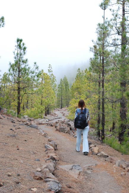 Идем мимо выжженных ландшафтов, почва тут вулканического происхождения, поэтому представляет собой просто куски лавы, изрезанные и обточенные временем. Вообще поскольку происхождение острова вулканическое, на этом острове нет никаких других пород, кроме вулканической лавы, так что дальше уточнения “вулканическое” я больше добавлять не буду. В этих местах выживают только сосны и кактусы, даже травы не видно. Правда скорее не из-за “вулканичности” почвы, а из-за засушливого климата в этом районе, поскольку, как мы увидели позже, на севере острова растительность на тех же вулканических породах гораздо богаче. Сосны здесь кстати особые, канарские, не приспособленные к выживанию в низких температурах.