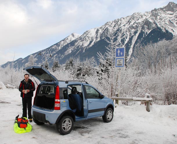Только начинает светать, туман, ничего не видно, до Шамони час езды. Мы приближаемся к горам, снега всё больше, вершины обступают нас всё плотнее. Еще даже не успев испугаться, потерявшись в незнакомом городе в поисках парковки, случайно сразу оказываемся где надо. Хотя надо ли нам было туда? 🙂 Парковка обледенелая, едем осторожно и еще раз мысленно благодарим дяденьку, который в офисе аренды машин дал нам “all wheel drive” – машина справляется со скользкой дорогой просто замечательно.