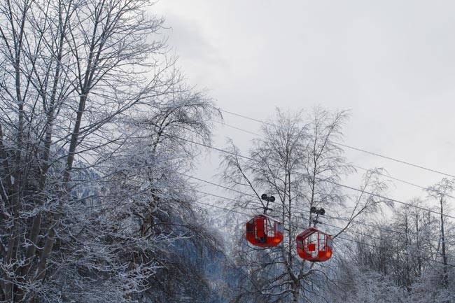 На обратном пути в вагончик канатки набилось народу, как в наши маршрутки в час пик – ну да в тесноте, да не в обиде. Лыжники тоже возвращались ни с чем – обычно они поднимаются на эту вершину, чтобы потом совершить захватывающий 20-ти километровый съезд вниз, по Белой Долине. Этот спуск и так пользуется недоброй славой среди лыжников из-за своей сложности и опасностей, поджидающих тех, кто не знаком с местностью, а в такую погоду спускаться по нему было почти равносильно тому, чтобы просто сразу прыгнуть вниз :).