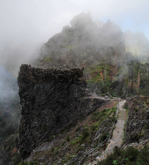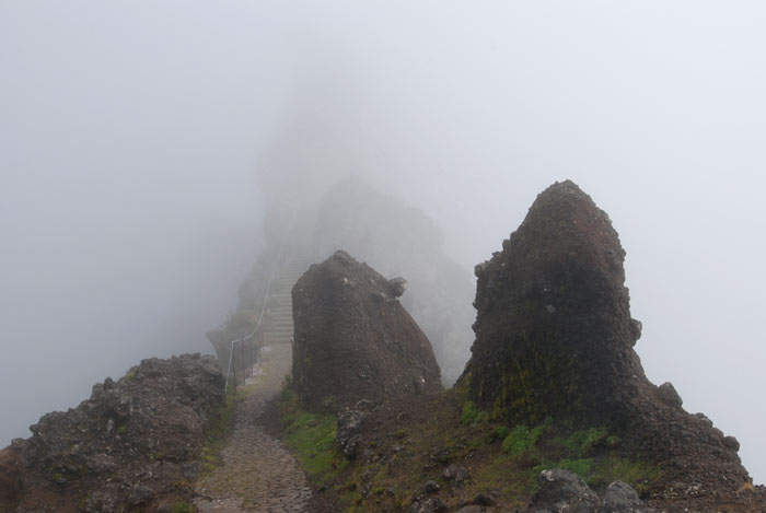 Ближе к начальной точке пути, вершине Ареейру, стало совсем весело – тропа становилась всё уже, с двух сторон обрыв, ветер усилился и порывался сбить нас с ног при любом удобном случае. До вершины еще добрый километр пути и всё, что есть в нашем распоряжении, это узкий перешеек, по которому надо пройти по-пластунски, уворачиваясь от внезапных порывов ветра, к нему прилагаются куски ограждения, которые то появляются, то исчезают в тумане, красные от холода пальцы, которым приказано вцепиться в это ограждение намертво, и обрыв с двух сторон тропы, в который глазам смотреть не разрешается :).
