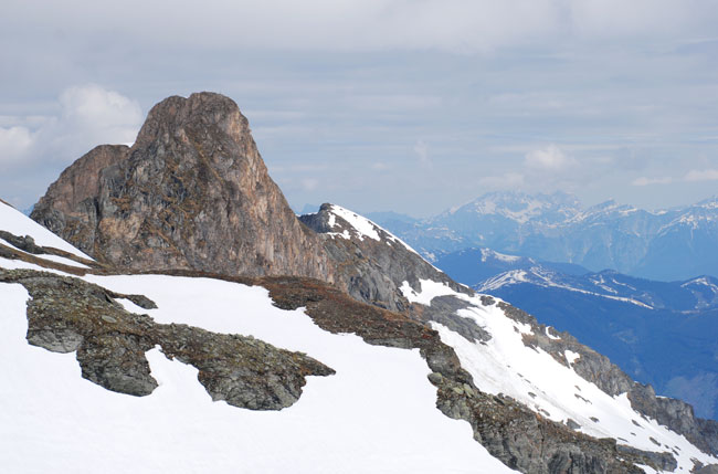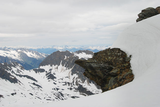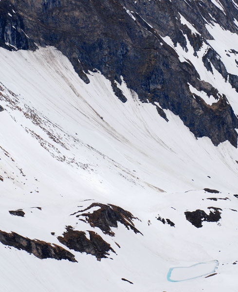 снаряжения туда лучше не соваться – весной снег бывает особенно коварным и может отваливаться целыми пластами. А мне уже и так достаточно – что-то этот подъем дается мне довольно тяжело, по снегу идти все-таки сложно, начинает чувствоваться что воздух разреженный. Да и ботинки, каждый из которых по полтора кило, дают о себе знать. Пять килограмм фототехники конечно не в счет, своя ноша она же не тянет ;).