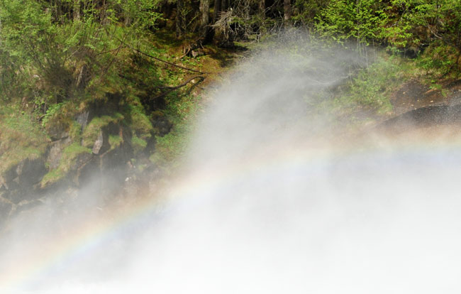380 метров. Сразу всплывают в воображении картинки высоченного водопада в джунглях Южной Америки, летящего единой струей с вершины горы… Но нет, здесь такого конечно нету, весь водопад целиком можно увидеть только издали, и состоит он из трех примерно равных по высоте под-водопадов, между которыми он переходит просто в бурлящую горную реку. Но даже стоя рядом с одним из таких “под-водопадов”, чувствуешь такую необузданную мощь стихии, что забываешь обо всем на свете (кроме, конечно, того, чтобы вытирать намокший объектив фотоаппарата каждые 5 секунд 🙂 ).