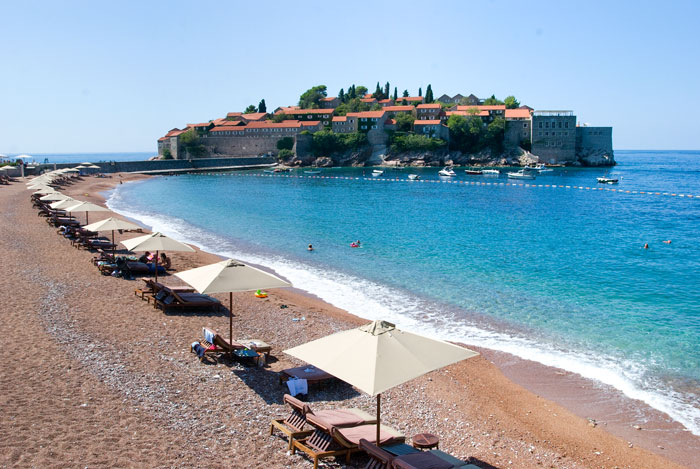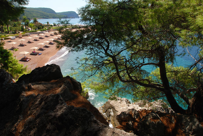 Но этим словом «Свети Стефан» называется вся деревушка, которая расположилась на «материке» (может для местных это и очевидно, но меня это поначалу сбивало с толку при планировании маршрута). Южнее острова Свети Стефан — бесплатный пляж для простых смертных, севернее — два пляжа для непростых. Первый пляж из непростых — 50 евро с человека в день: