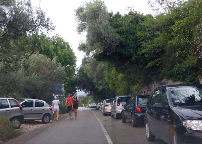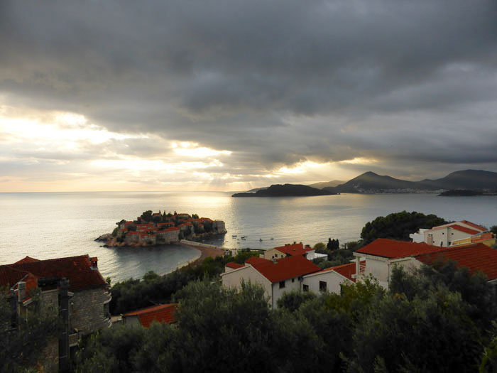 Нет, мы не настолько эстеты, чтобы ползти по 40-градусной жаре вверх (ага, вдоль автомобильной дороги без тротуара), чтобы насладиться видами на остров Свети Стефан сверху.
