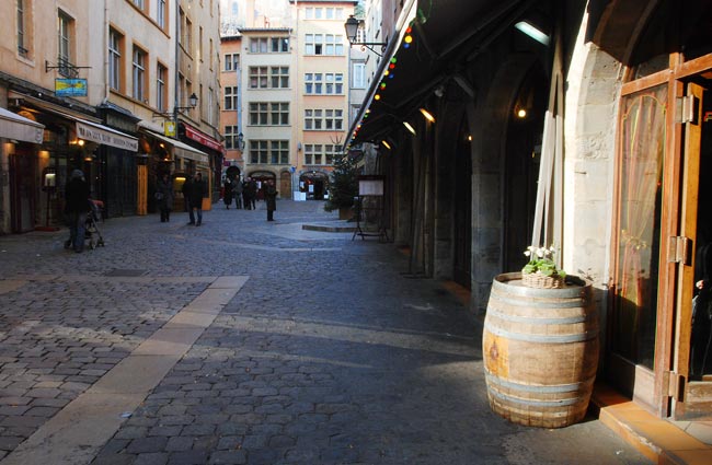 На сытый желудок ходить стало веселее и улицы уже казались не такими холодными и каменными, и солнце не таким зимним. Прошли пару небольших площадей, одна из них служила в 18 веке биржей, представлявшей весь финансовый рынок Франции, сделки здесь совершались прямо под открытым небом. От улочек ответвляется много каких-то узких проходов, дворов. К сожалению, я только после поездки вычитала, что Лион, кроме прочего, известен своими потайными ходами, или “трабулами” – изначально они использовались, чтобы быстро спускаться к реке за водой или для транспортировки товаров. Позже пригодились во время фашистской оккупации. А сейчас они внесены в список всемирного наследия ЮНЕСКО, хотя, полагаю, продолжают использоваться местными жителями по их прямому назначению (где-то вычитала, что с 1988 года Лион находится на 5-м месте в списке Мирового Наследия Юнеско, правда по каком признаку строится этот “хит-парад”, не знаю 🙂 ).