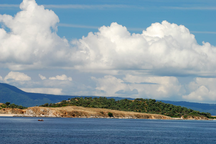 С утра трёхчасовая морская экскурсия на Афон, узкий 60-ти километровый полуостров, известный своими православными монастырями. Пейзажи удивительно напоминают мыс Айя под Севастополем (не считая оливковых и апельсиновых рощ, конечно 🙂 ). Вообще, на материковой Греции действительно можно найти очень много аналогий с нашими крымскими пейзажами – православные монастыри, приютившиеся среди скал, мусульманские минареты, обрывистые морские берега и… да, конечно, собственно древнегреческие развалины :).
