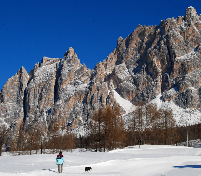 Немного не доезжая Кортины, свернули с дороги на оборудованную стоянку (кстати, так мы и нашли это место – заинтересовались, зачем сюда приехали другие машины ), и отправились ходить на снегоступах в районе, который вроде называется Castel S. Uberto. А вообще вся эта местность входит в национальный парк Dolomiti Bellunesi.