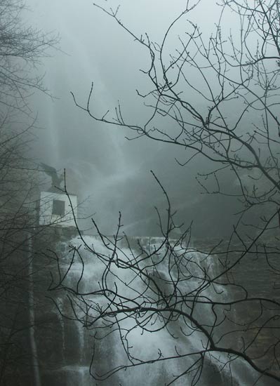 Из Ялты доехали на маршрутке до водопада Учан-Су, погода была довольно “загадочная” – все было в густом тумане и моросил дождь. Очень неудобно было фотографировать – мало того что сверху капал дождь, так объектив становился мокрый за пару секунд от брызг водопада. Водитель маршрутки обещал подождать нас 25 минут, мы пришли примерно через 35 и его уже и след простыл. Стали думать как теперь добираться до трассы, так как он пообещал что больше