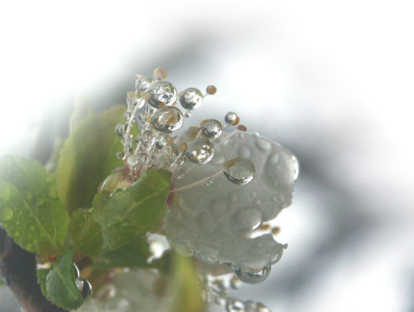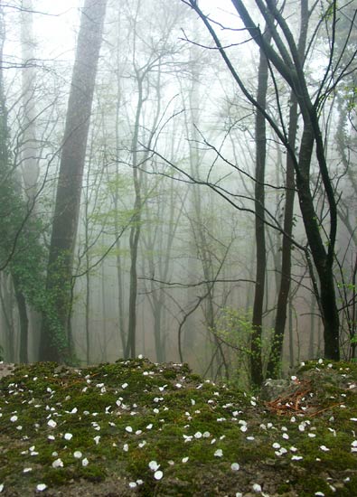 рейсов сегодня делать не будет. Поприставали к водителям экскурсионных автобусов, но они были неумолимы :). И мы пошли медленно и печально по дороге к трассе (8 км). В общем-то идея прогулки меня радовала – погода очень даже располагала к фотографированию – дорога, сосновый лес и туман. Когда мы свернули на тропу, мне это понравилось еще больше. Мы решили что идти по асфальту это неинтересно и решили поверить что отходящая от дороги тропа и есть сокращенка до Поляны Сказок. Тропа мне понравилась сразу – в самом начале стояло цветущее дерево, на каждом цветочке которого висели капельки. Через минут 10 я смогла от него оторваться и мы пошли дальше. Чем дальше шли, тем больше мне хотелось сказать спасибо водителю маршрутки, который нас не дождался 🙂 Было немного грязно, но только немного. По пути перепрыгнули через красивую речку с водопадиком. И неожиданно вышли к цивилизации (какому-то пионер. лагерю), откуда уже была видна Поляна Сказок. Даже грустно как-то стало – слишком быстро все закончилось (шли часа 2) 🙂 Встретив еще несколько “правильных” деревьев – т.е. цветущих и в капельках, мы дошли-таки до поляны.