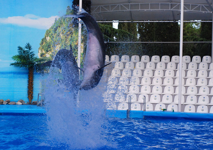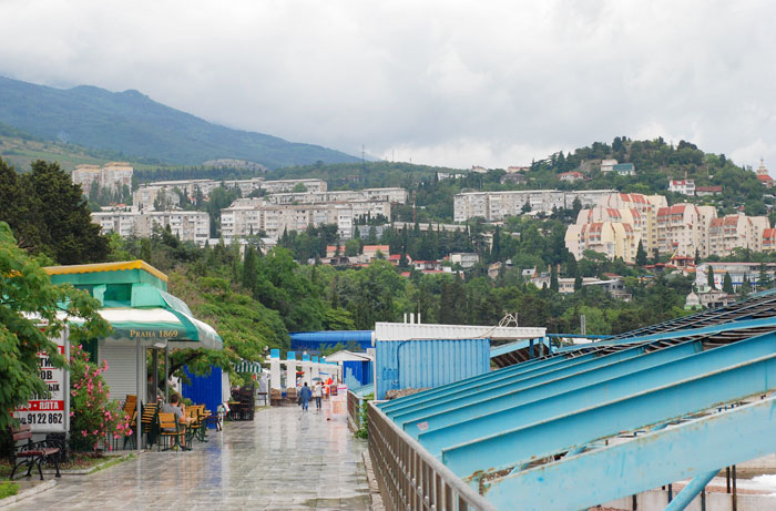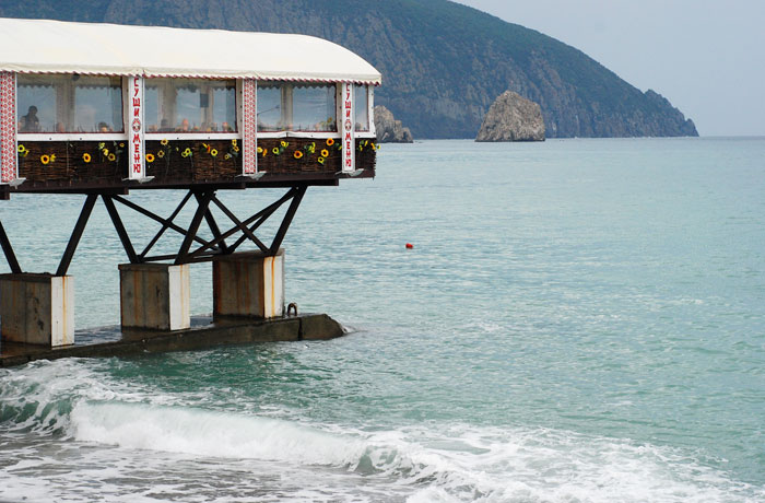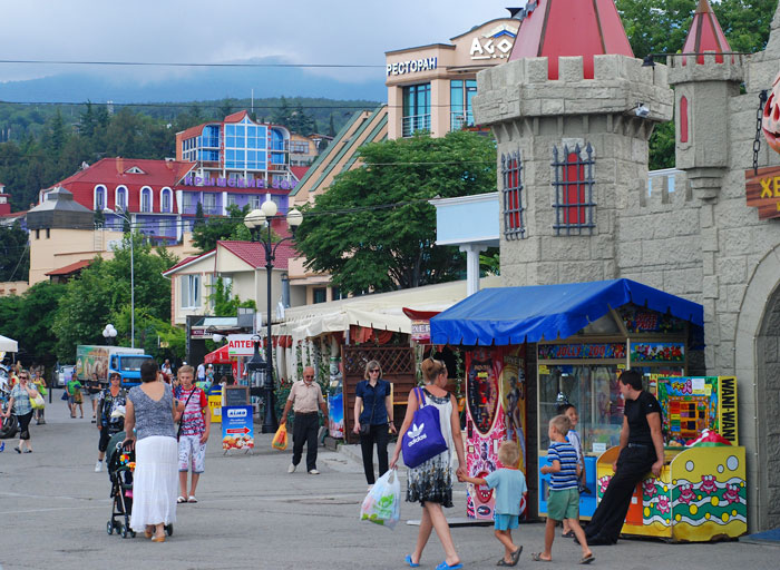Алушта, с крохотным аквариумом (в котором можно покормить крокодилов с удочки) и дельфинарием: