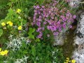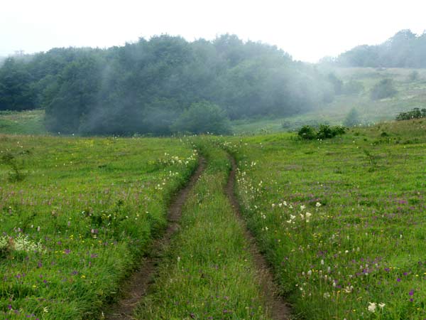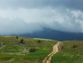 палатки, машины… Я все время отставала от своих попутчиков, пытаясь понять, чем по вкусу карабийская земляника отличается от долгоруковской. По дороге нас настиг дождь, порадовав своей неожиданностью – куртки и т.п. мы оставили в рюкзаках, которые остались у подножия :). Когда сошли с дороги в огороды, Саша неосмотрительно сказал – здесь надо быть осторожнее, смотрите под ноги… Ну я и посмотрела… Почему-то моя фраза “какая она тут спелая и большая”, приковала всех остальных к этой полянке минут на 20 :). Женя ползал с камерой по всей поляне, Саша причитал что он бы хотел сегодня возвратиться домой и пора идти, а я фотографировала дивные красные ягоды, сразу же после съемки съедая своих фотомоделей :). А потом начался подъем на Каратау – вверх, без тропинки, через пестрые заросли горных цветов. К концу подъема у меня уже начало рябить в глазах от сиренево-желто-красных переливов, но это не мешало мне попутно собирать чабрец :). Выбравшись на вершину, мы увидели что с юго-востока к нам побираются тучи, которые уже заползали на плато со стороны Чегинитры. Решили в пещеру не идти, а побыстрее возвратиться к рюкзакам. Вернулись уже по дороге. Опять прошли через крапивную поляну и надо же мне было заметить, что