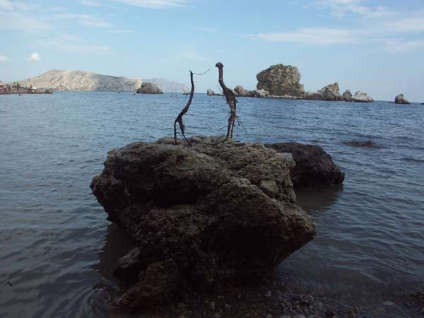 выходят клиняные осыпи и когда заходишь в море, идешь по жидкой глине. Естественно, много людей, которые пытаются излечиться этой глиной, намазавшись с ног до головы 🙂 В море был остров по форму напоминающий… лотос 🙂 Может это просто фантазия у нас разыгралась, но вдохновленные увиденной выставкой бансая на прошлой неделе,мы еще сооружили из каких-то коряг композицию под названием “Два фламинго”.