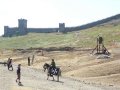 Билеты купили заранее, так как собирались выехать очень рано. В субботу вечером немного попугал дождик, но наших планов не изменил и в 7 утра мы выехали в Судак. В 9 были на месте, сразу купили обратные билеты на автобус с устрашающей маркой ЛАЗ (на другие билеты уже были распроданы). Начали расспрашивать местных, как пройти к крепости. Все делали серьезное лицо и говорили что пешком туда никак не дойти, надо влезать в переполненную маршрутку. Но мы все же пошли пешком. Судак ОЧЕНЬ пыльный город, пыль буквально везде – и в воздухе и на дорогах. За час добрели до крепости. Там как раз на этих выходных проходил рыцарский турнир. На входе стояли рыцари, как и положено, но внутри… вместо ожидаемого рыцарского шоу, была какая-то тупая развлекательная программа, которая нас не вдохновила чтобы задержаться там подольше, и мы пошли дальше. Прошли мимо рыцарских мастерских, стрельба из арболета (типа лука) соблазнила меня проверить свои робингудские способности и выстрелить разок. Обошлось без жертв 😉 Хотя честно говоря все свои физические и умственные усилия я прикладывала только для того, чтобы натянуть и удержать тугую тетиву, а целилась куда придется :). Обошли вокруг крепости, народа было море – все-таки лето. В 11 утра начался рыцарский поединок, который мы посмотрели издалека, из одной из бойниц крепости :). На выставку орудий пыток времен