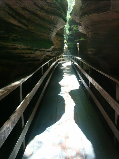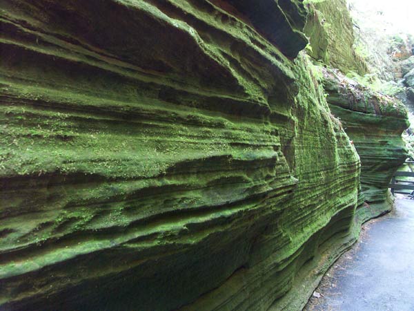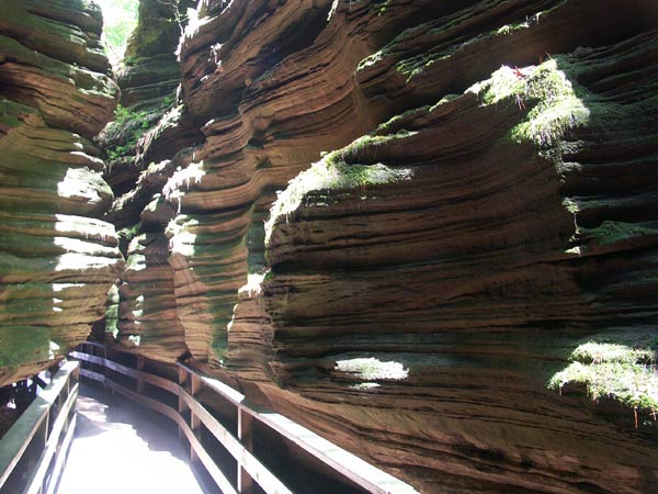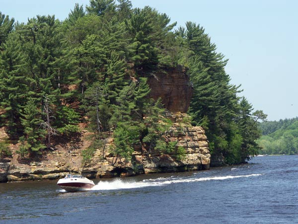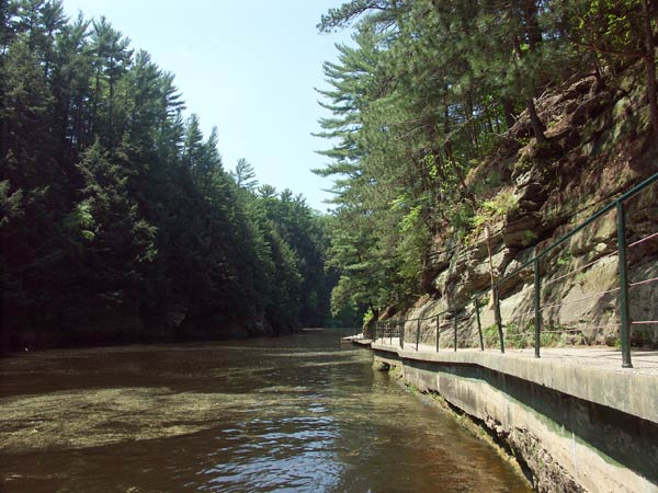 На этих выходных мы ездили не так далеко на север (теперь 300км кажется вообще “рядом”) – в место под названием Висконсин Деллс (Wisconsin Dells). Ну Висконсин понятно по названию штата, а деллс – от французского слова, обозначающего в моем вольном переводе с английского “слоеные скалы” (вообще тут много французских названий, в силу исторических причин). Собственно в названии заключена основная прелесть этого места – это действительно слоеные скалы, образующие берега реки Висконсин. Состоят они из песчаника и если верить ученым, образовались 500 млн. лет назад когда этот учаток был дном некого безымянного моря. А разломы и собственно река Висконсин образовались во время последнего ледникового периода.