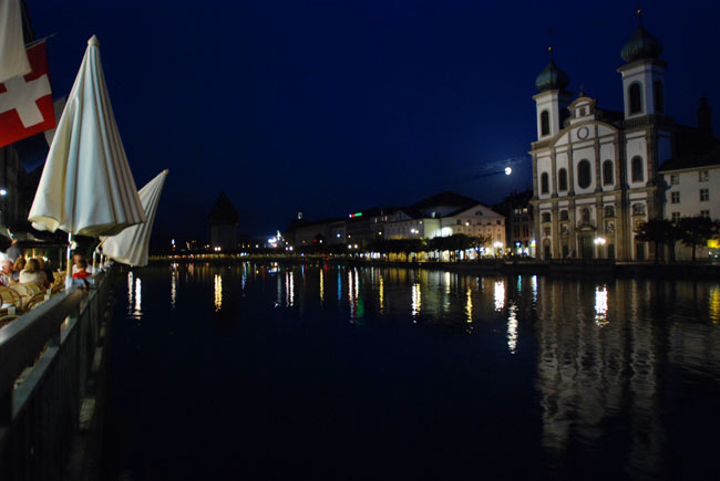 Вечером прогулка по вечернему Люцерну и ужин в ресторанчике на старой площади города. Оборонительную стену города мы не успели посмотреть, хотя находилась она в нескольких метрах от нашего отеля. Зато мы мимо нее проехали на машине, вернее сквозь нее – дорога идет прямо через выдолбленную дырку в одной из оборонительных башен :).